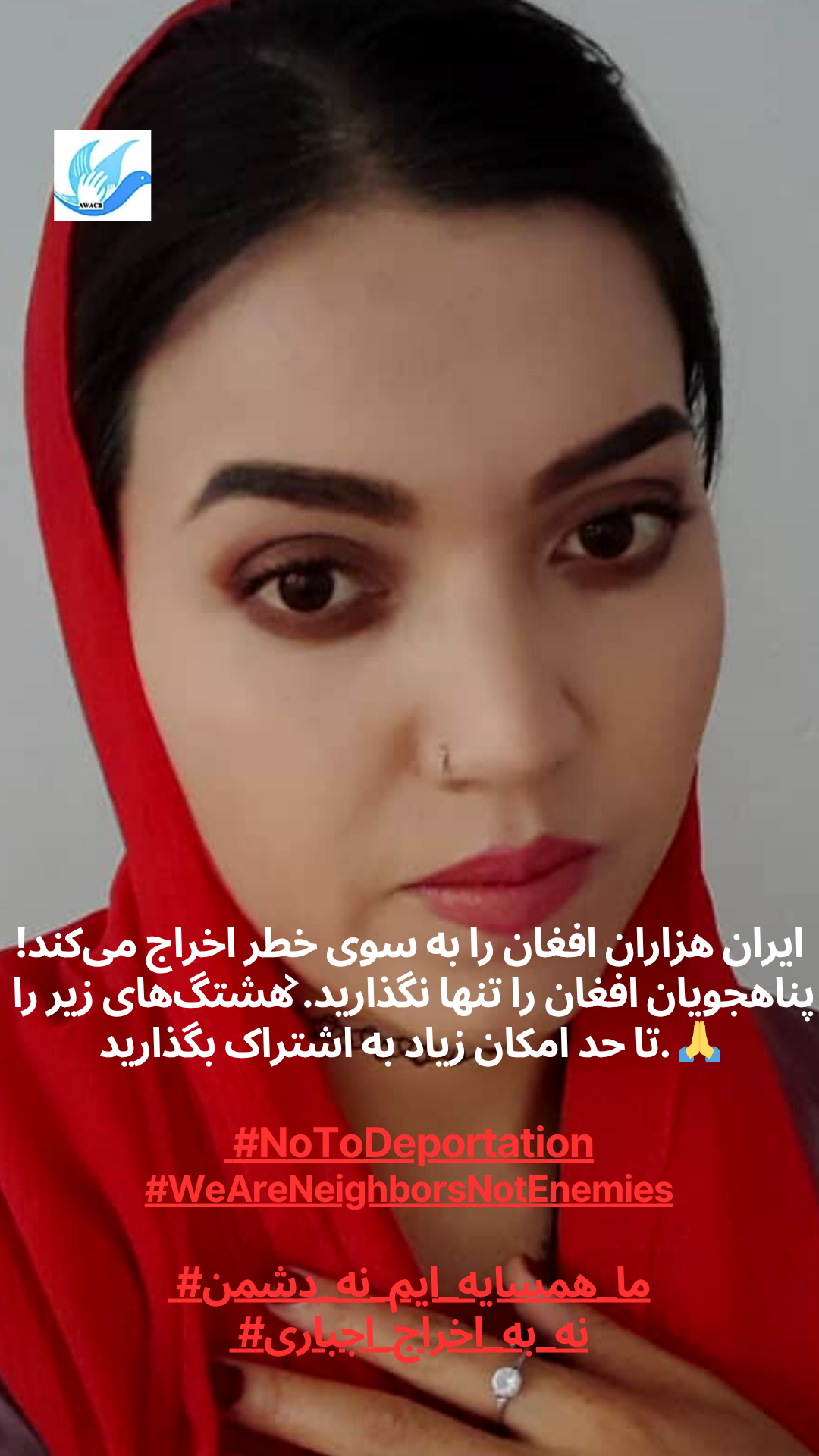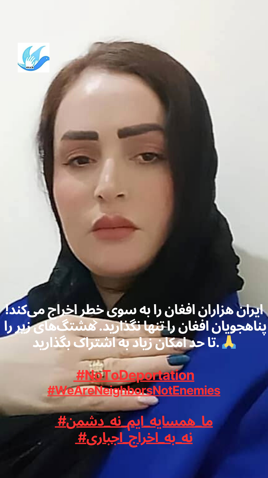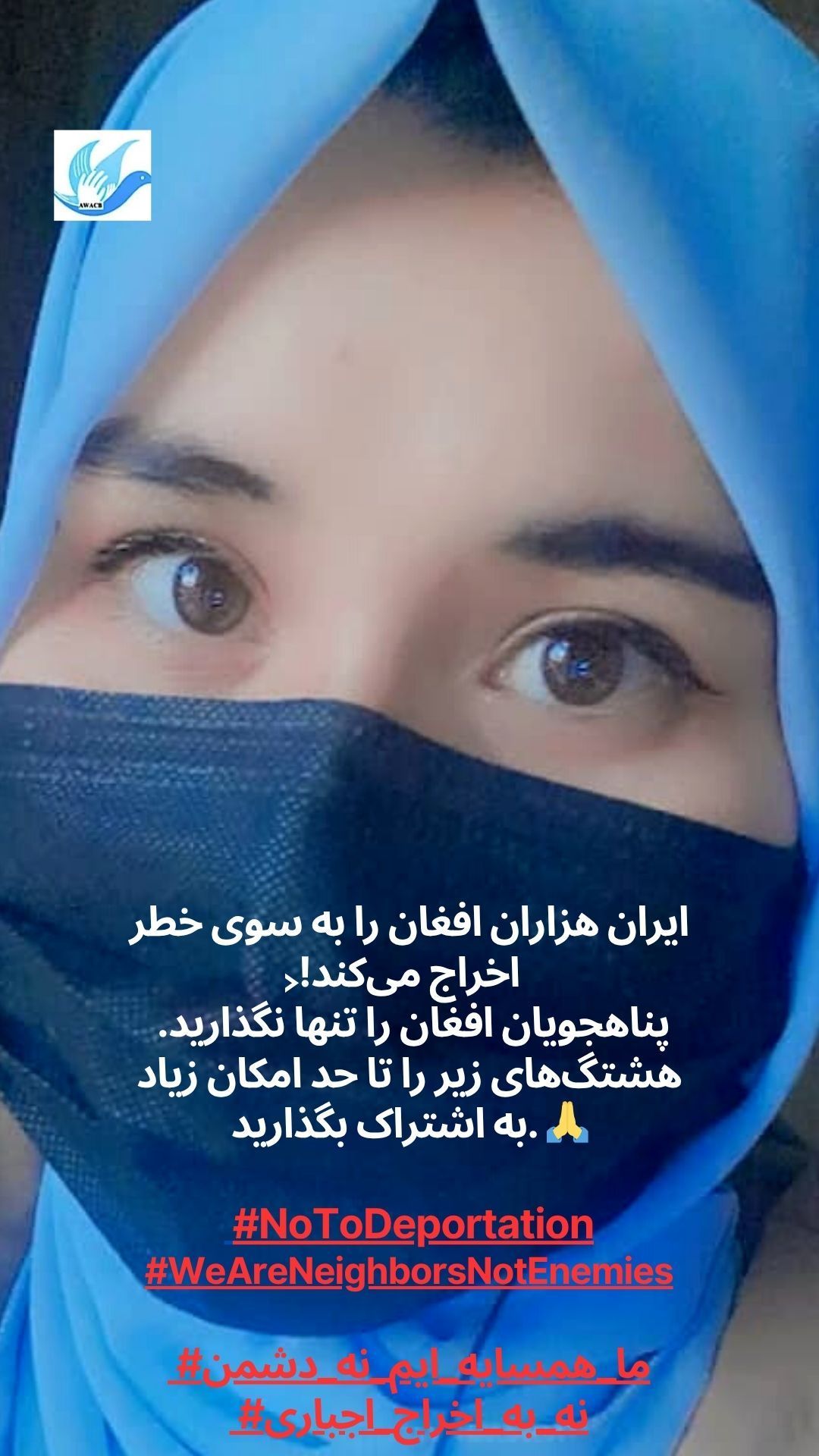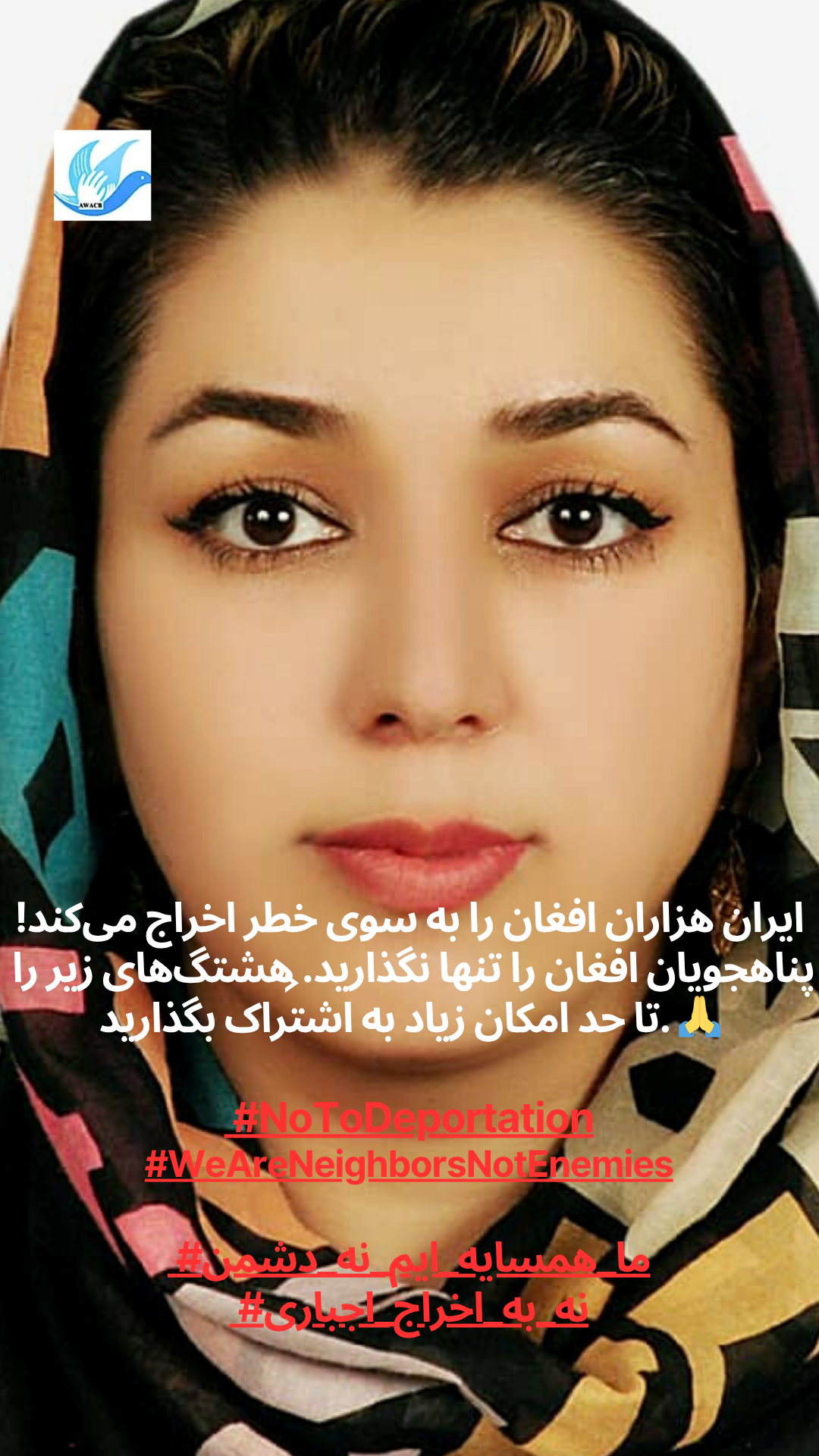 أطلقت منظمة AWACB هذه الحملة بصور لنساء وشباب وناشطين أفغان يقفون معًا ويرفعون أصواتهم في رسالة قوية واحدة إلى الحكومة والشعب الإيراني: